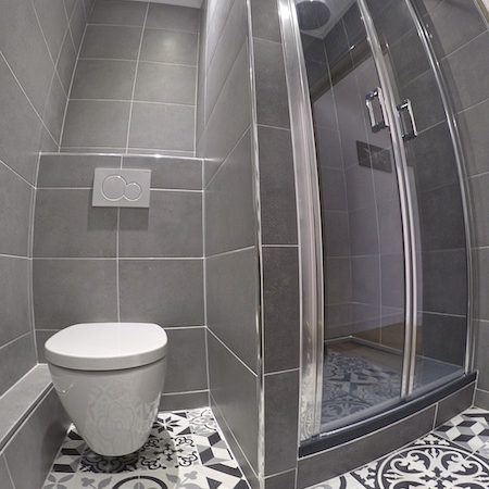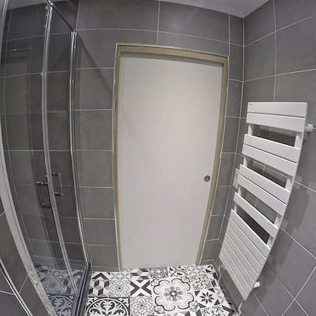- Pose d’une porte coulissante à galandage SCRIGNO dans la salle de bain