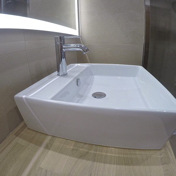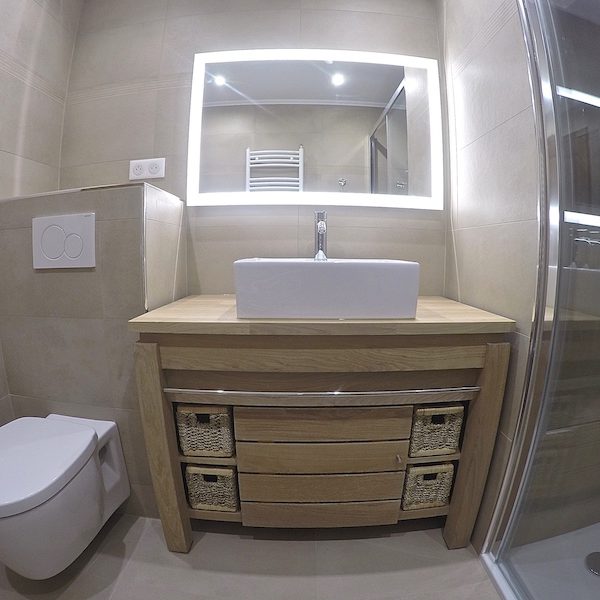 - Pose d’un meuble vasque en chêne massif de la marque LINE-ART