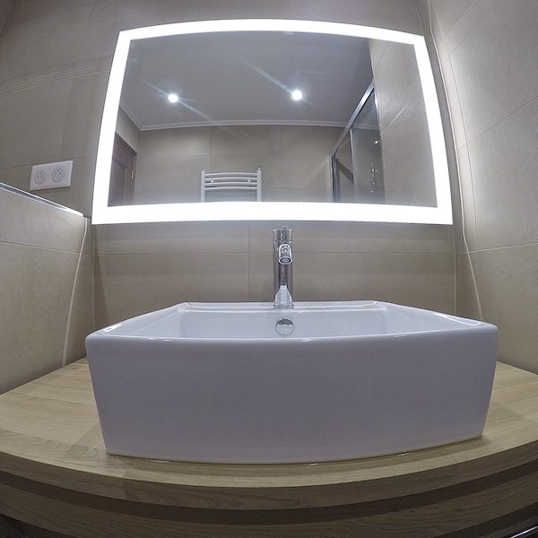 - Pose d’un miroir avec éclairage LED et allumage infra-rouge de la marque SANIJURA, gamme REFLET – LUZ