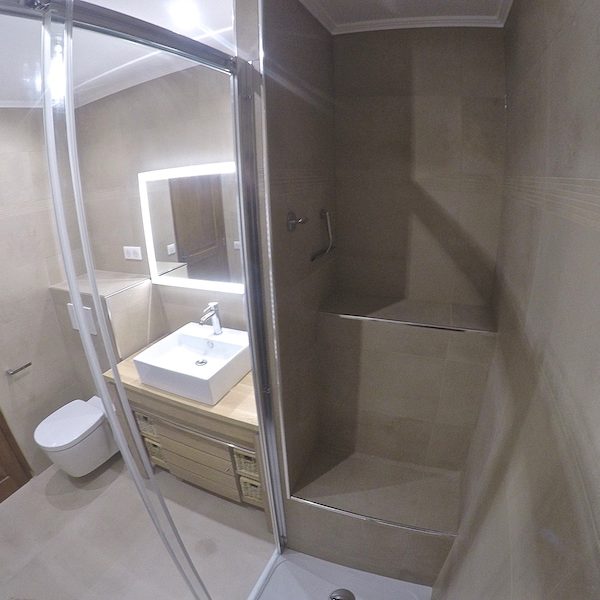 - Création d’un espace de douche comprenant un banc à double niveaux intégré au volume
