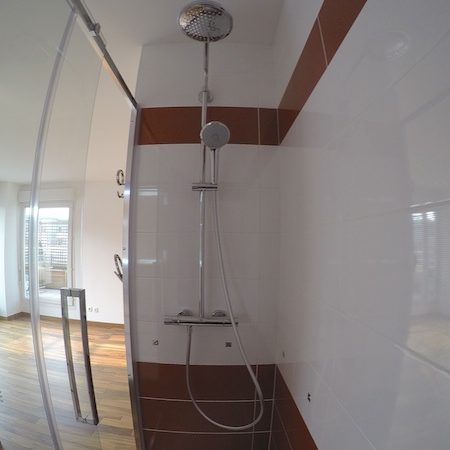 - La pose d’une porte de douche coulissante de 120cm à deux vantaux en verre SECURIT 6mm sur cadre en aluminium chromé anti-corrosion.