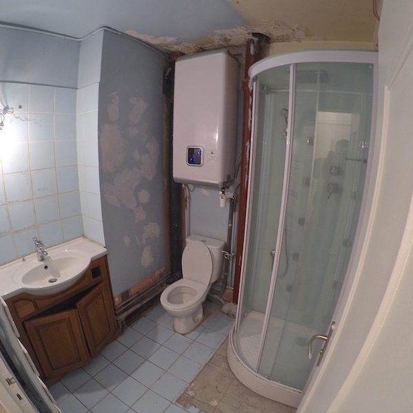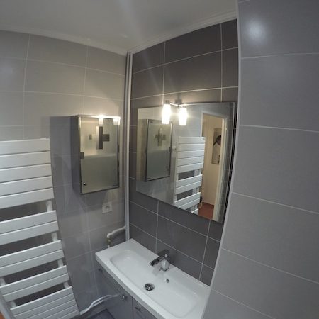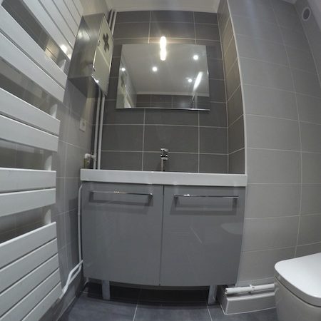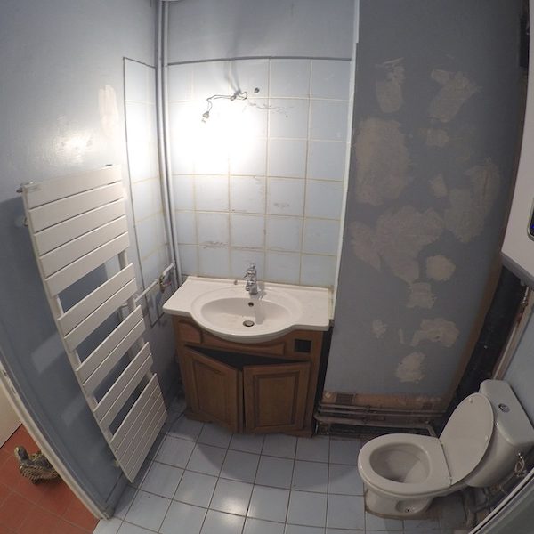 Il s’agit d’une petite salle de bain de moins de 4m2 située dans un appartement au rez de chaussée d’une petite copropriété