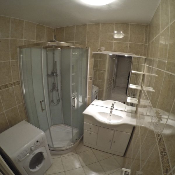 Il s’agit d’une petite salle de bain située dans un appartement au rez de chaussée d’une petite copropriété