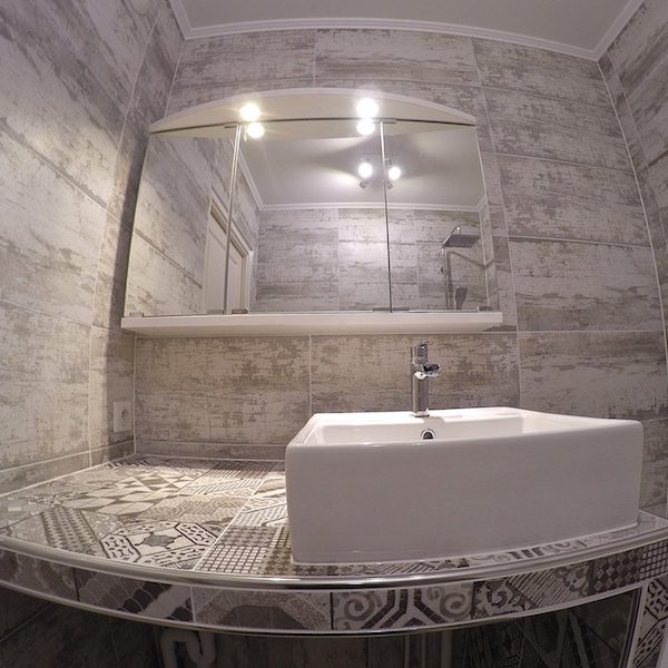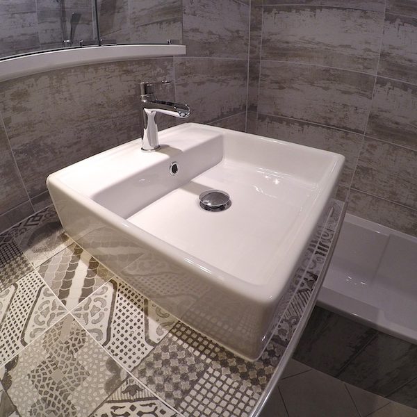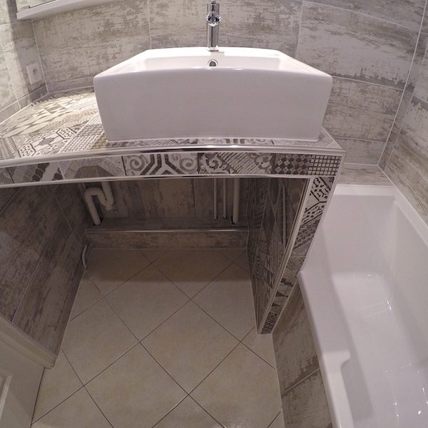 - La pose intégrale de carrelage à motifs divers sur le plan vasque